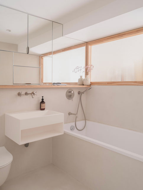 With approximately 80 m² of living space (89.95 m² total floor area), this duplex has been fully redesigned by an interior architect, combining practicality with style. The property boasts custom built-in storage, oak parquet flooring, designer fireplaces, cozy window seating, and walls painted in curated Farrow & Ball tones. The ground floor hosts a welcoming living room with a dedicated office nook, an open-plan kitchen flowing into a spacious dining area, and access to three distinct outdoor spaces — including a large 30 m² southwest-facing terrace adorned with lush vegetation and an outdoor shower. Two bedrooms, each with their own en-suite (shower room and bathroom), along with a storage room, complete the home.